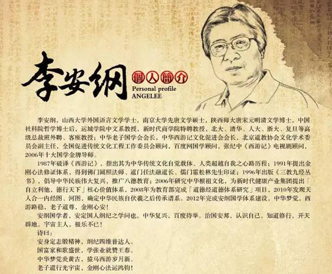 李安綱,山西大學(xué)外國語言文學(xué)學(xué)士,南京大學(xué)先唐文學(xué)碩士,陜西師大唐宋元明清文學(xué)博士,中國社科院哲學(xué)博士后,運(yùn)城學(xué)院中文系教授,新時(shí)代商學(xué)院特聘教授,北大、清華、人大、浙大、復(fù)旦等高級(jí)總裁班外聘、客座教授;中華老子國學(xué)會(huì)會(huì)長(zhǎng),北京道教協(xié)會(huì)文化學(xué)術(shù)委員會(huì)副主任,全國促進(jìn)傳統(tǒng)文化工程工作委員會(huì)顧問,百度網(wǎng)國學(xué)顧問,張紀(jì)中《西游記》電視劇顧問,2006年十大國學(xué)金牌導(dǎo)師。