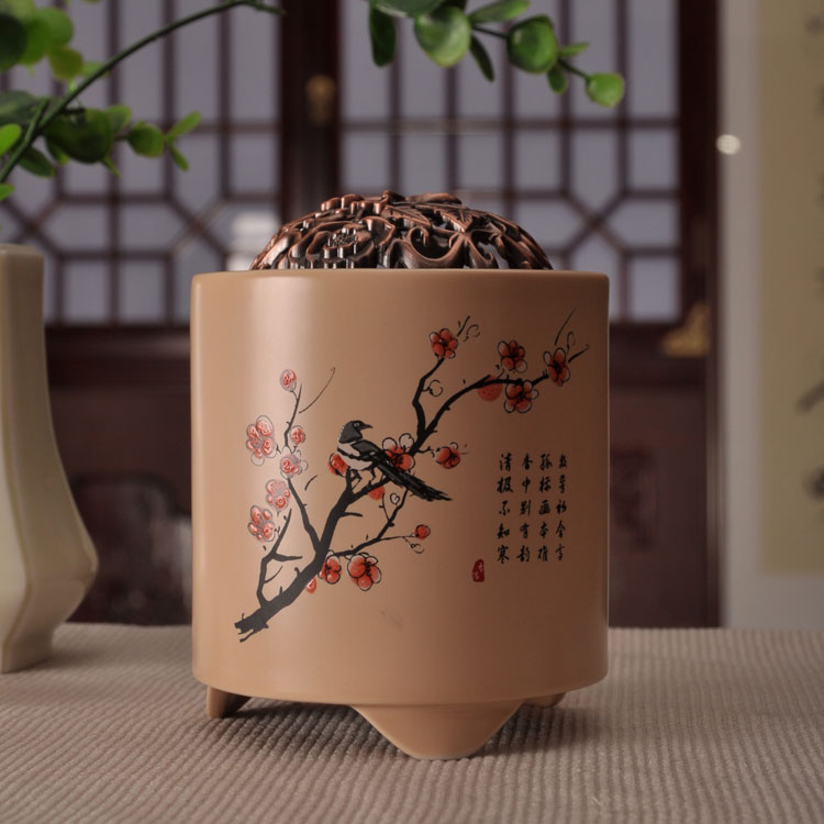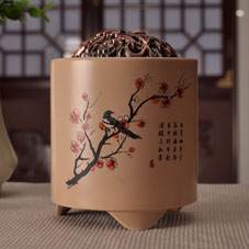 這是一款水煮爐,或者叫蒸汽爐,根據(jù)高溫蒸餾法原理,將沉香木材、芳香花瓣等放入沸騰的爐中,同時具有香薰和加濕的作用。爐身繪花鳥吉祥圖案,搭配金屬鏤空蓋使其更顯質(zhì)感華貴。梅花為報春之花,凌寒傲雪,冰心鐵骨,象征著堅韌不拔、不屈不撓、奮勇當(dāng)先、自強(qiáng)不息的君子品格,是中華民族精神的象征,具有強(qiáng)大而普遍的感染力。喜鵲寓意“喜”,而喜鵲站立于梅梢上則寓意為“喜上眉梢”。